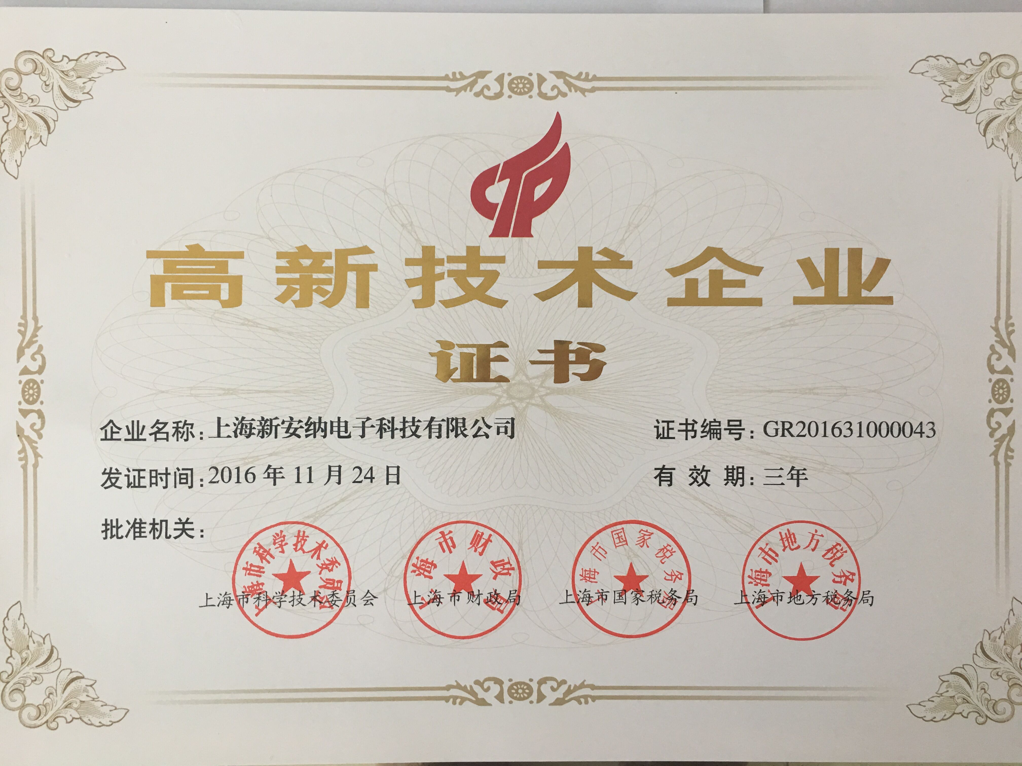 2016.11.24 熱烈祝賀新安納公司榮獲“上海市高新技術(shù)企業(yè)”稱號