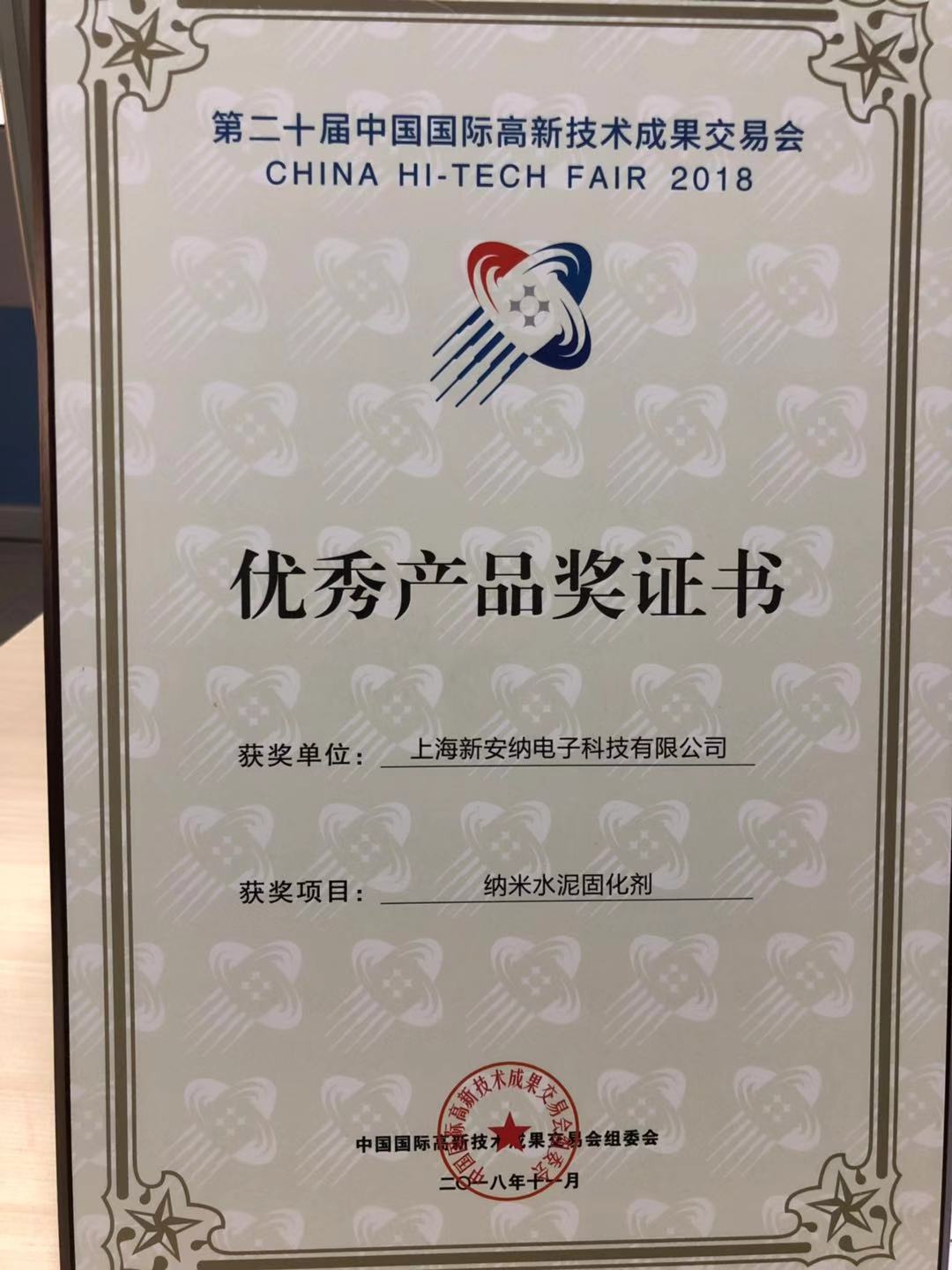 熱烈祝賀上海新安納電子科技有限公司榮獲第二十屆中國(guó)國(guó)際高新技術(shù)成果交易會(huì)“優(yōu)秀產(chǎn)品獎(jiǎng)證書(shū)”,獲獎(jiǎng)項(xiàng)目“納米水泥固化劑”。